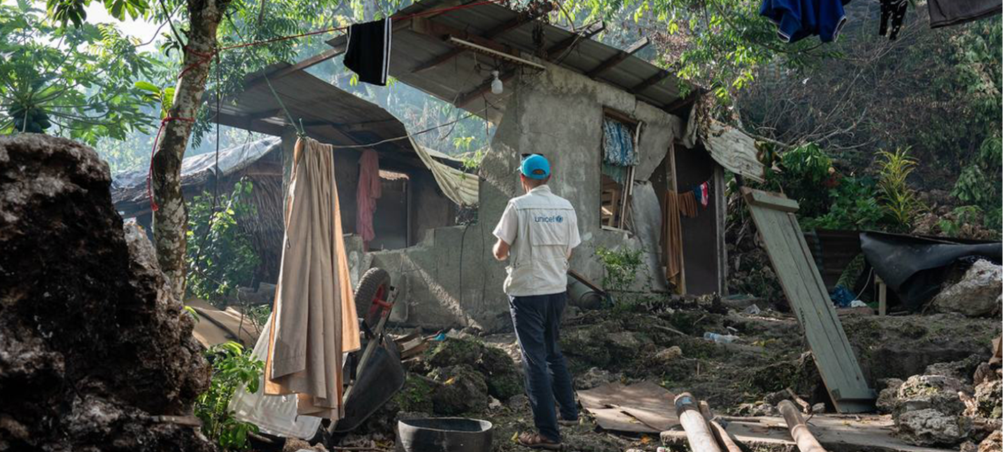 © UNICEF/Damian Mobbs A UNICEF water and sanitation (WASH) specialist inspects the damage caused by the earthquake in Mele Maat village, about 10 kilometres northwest of Port Vila, the capital of Vanuatu.